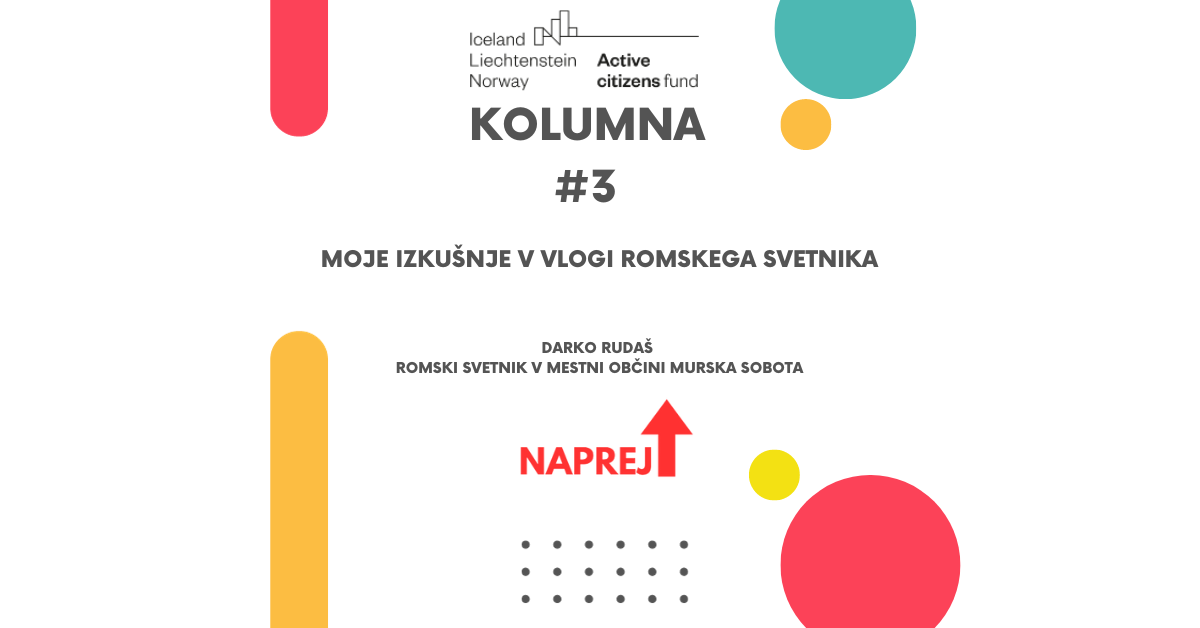 V okviru projekta NAPREJ je tretja kolumna namenjena raziskovanju vloge romskega svetnika v lokalnem okolju. V tokratnem zapisu delimo misli Darka Rudaša, izkušenega romskega svetnika v Mestni občini Murska Sobota, ki se ponaša s kar 30 leti izkušenj na področju razvoja romske skupnosti. Darko Rudaš, poleg svoje vloge romskega svetnika, uspešno opravlja tudi funkcijo predsednika Foruma romskih svetnikov… Continue reading Kolumna #3: Moje izkušnje v vlogi romskega svetnika